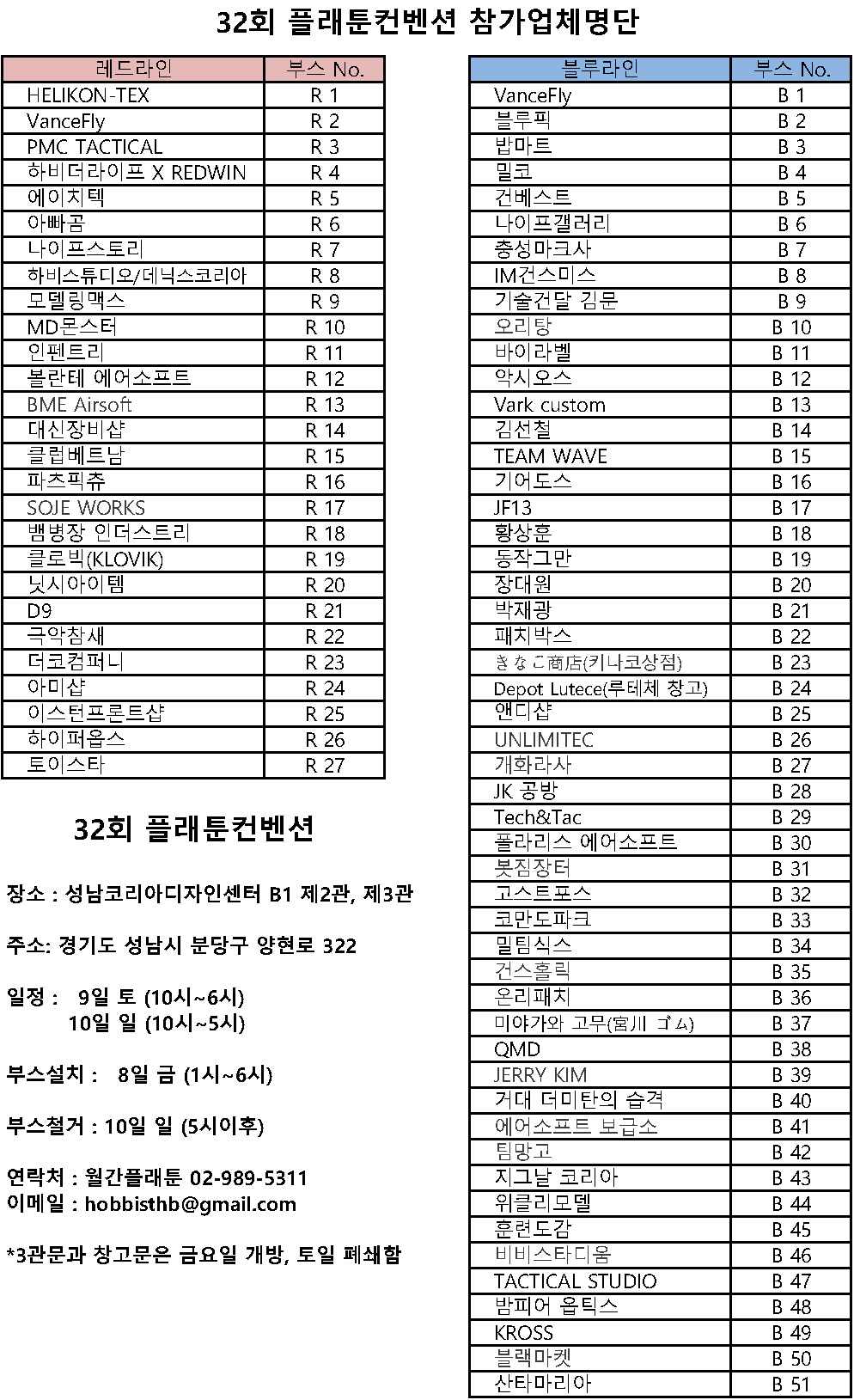 2023년 하반기 플래툰 컨벤션 배치도 및 참가업체 명단입니다. 많은 성원 부탁드립니다. 관련기사 플래툰 2023년 12월호 발매 32회 컨벤션 입장객 추첨 이벤트! 32회 플래툰 컨벤션 관람안내 K7 탄창에 대한 미묘한 오해 키워드 #플래툰컨벤션 #32회 플래툰컨벤션 #컨벤션 월간 플래툰 webmaster@platoon.co.kr 다른기사 보기 저작권자 © 월간 플래툰 무단전재 및 재배포 금지 당신만 안 본 뉴스 플래툰 2025년 12월호 발매 플래툰 2025년 11월호 발매 플래툰 2025년 10월호 발매 36회 플래툰 컨벤션 참가신청 안내 제36회 플래툰 컨벤션 플래툰 2025년 9월호 발매 플래툰 2025년 8월호 발매 플래툰 2025년 12월호 발매 댓글삭제 삭제한 댓글은 다시 복구할 수 없습니다. 그래도 삭제하시겠습니까? 비밀번호 닫기 기사 댓글 0 댓글 접기 댓글 내용입력 비회원 로그인 이름 비밀번호 댓글 내용입력 댓글쓰기 계정을 선택하시면 로그인·계정인증을 통해 댓글을 남기실 수 있습니다. 회원 로그인 비회원 글쓰기 이름 비밀번호 자동등록방지 로그인 옵션 창닫기 주요기사 플래툰 2025년 12월호 발매