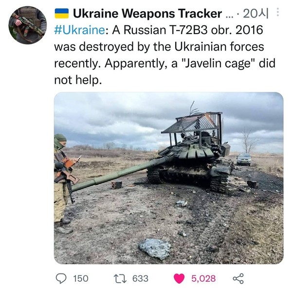위 사진은 여러분도 잘 아시는, 베를린 공방전 당시의 T-34/85다. 판쩌파우스트 공격을 막기 위해 철망이나 침대 프레임등을 전차 상부까지 부착한 모습인데, 이 모습을 무려 77년만에 다른 형태로 보게 된 셈이다.