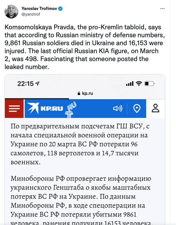 그런데 이 매체가 러시아측 전사자가 9,861명, 부상자는 16,153명이라는 수치를 보도해버린 것이다. 러시아군 공식 전사자 발표가 3월 2일의 498명 이후 전혀 움직이지 않는 것과는 터무니없을 정도로 대조적인데, 심지어 해당 매체는 이것이 러시아 국방부에서 제공한 자료라고까지 적었다.